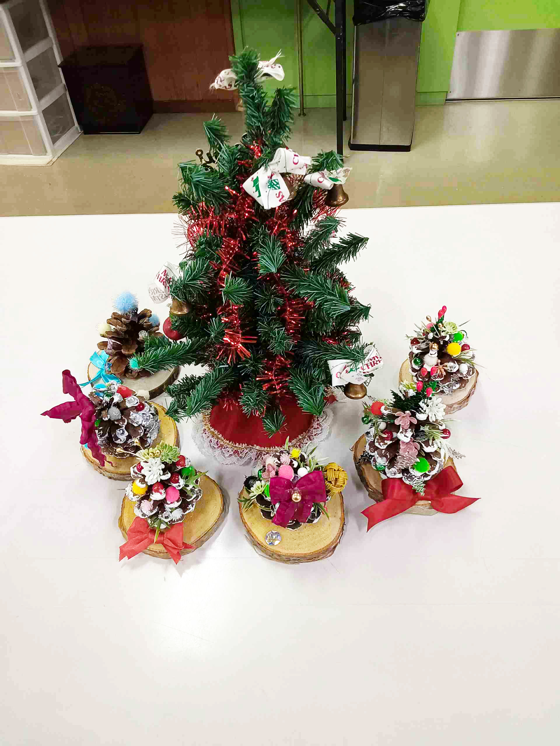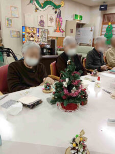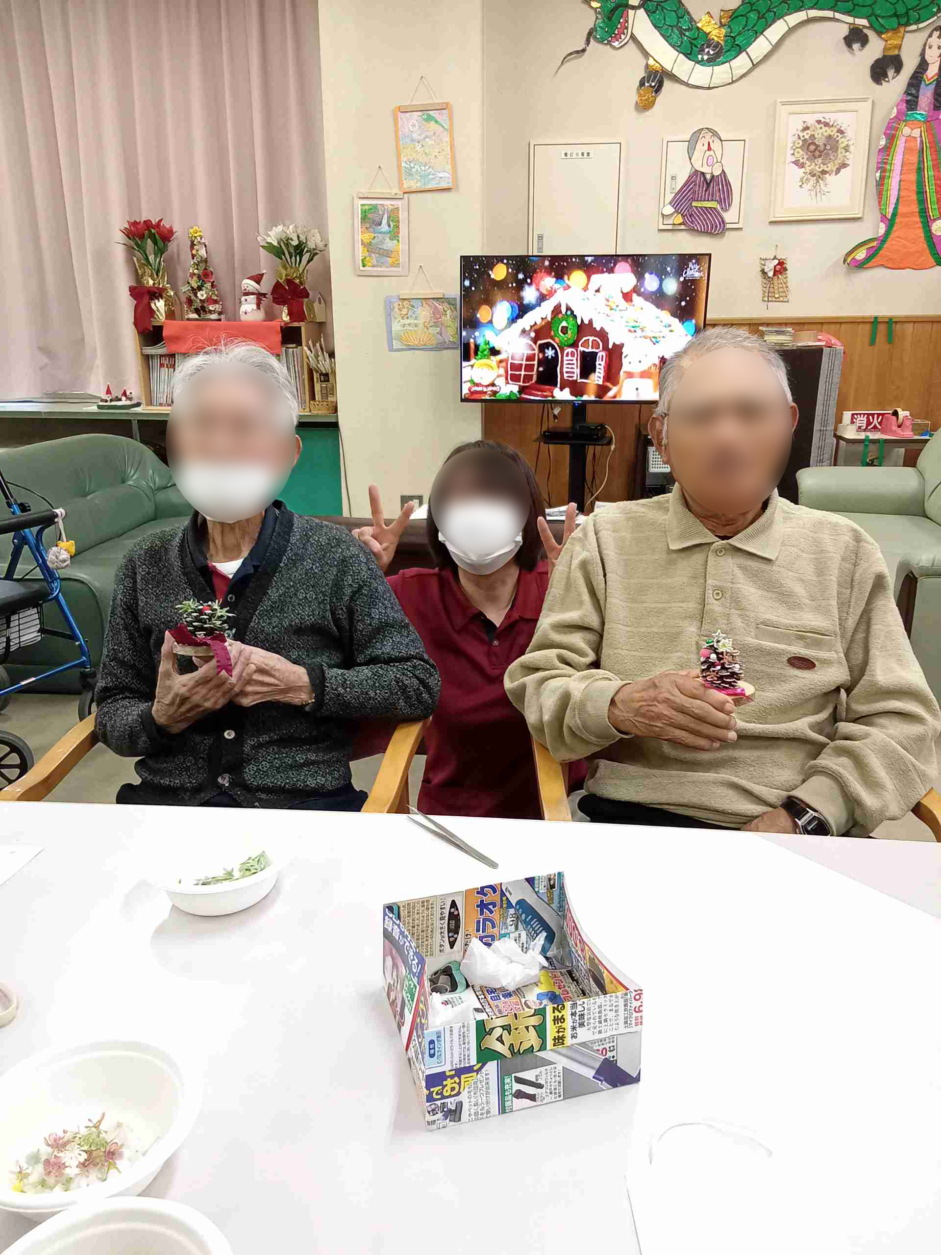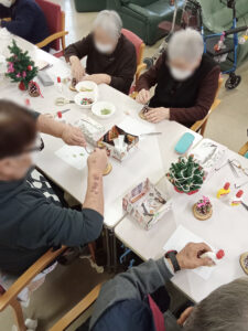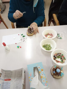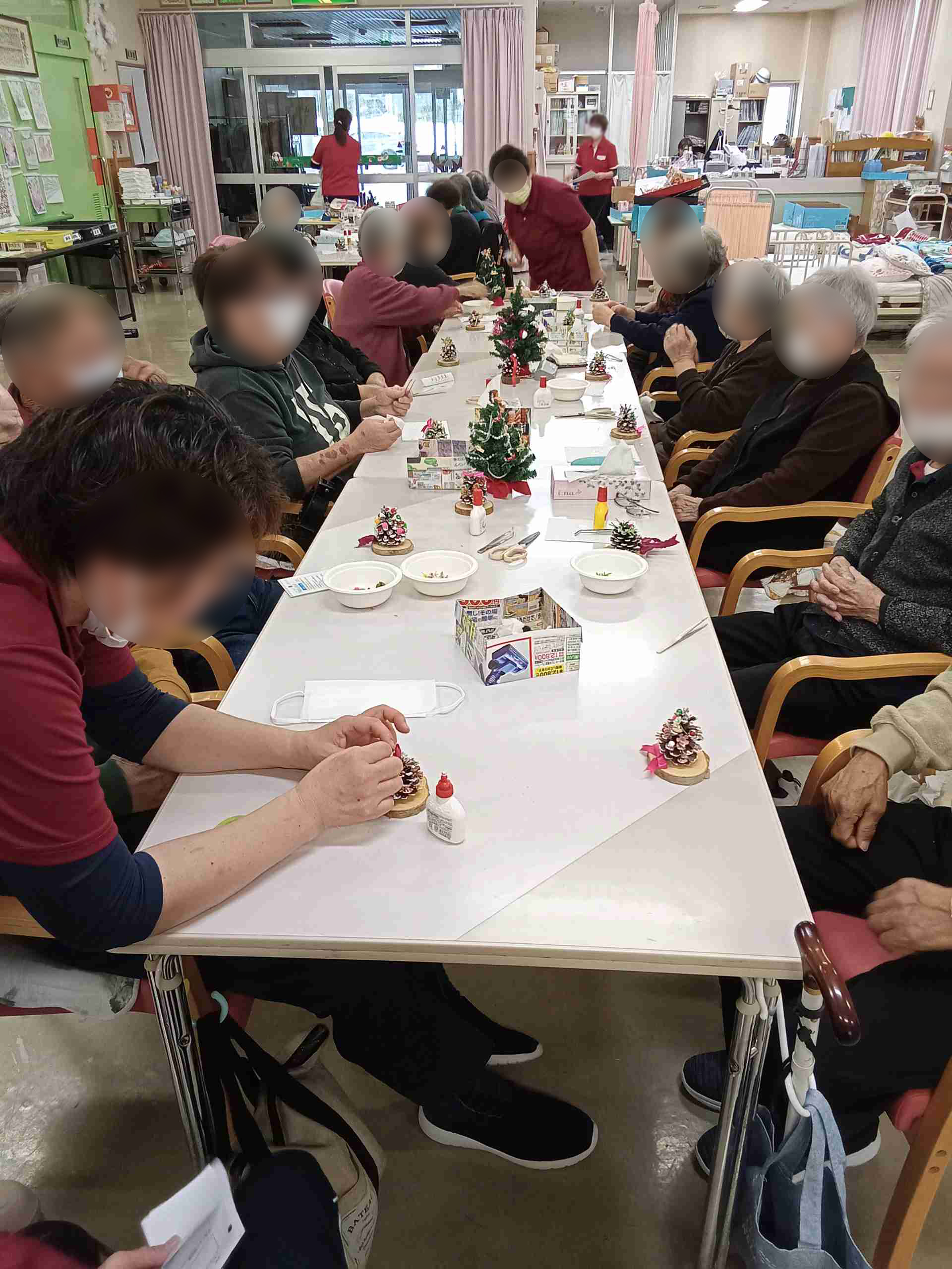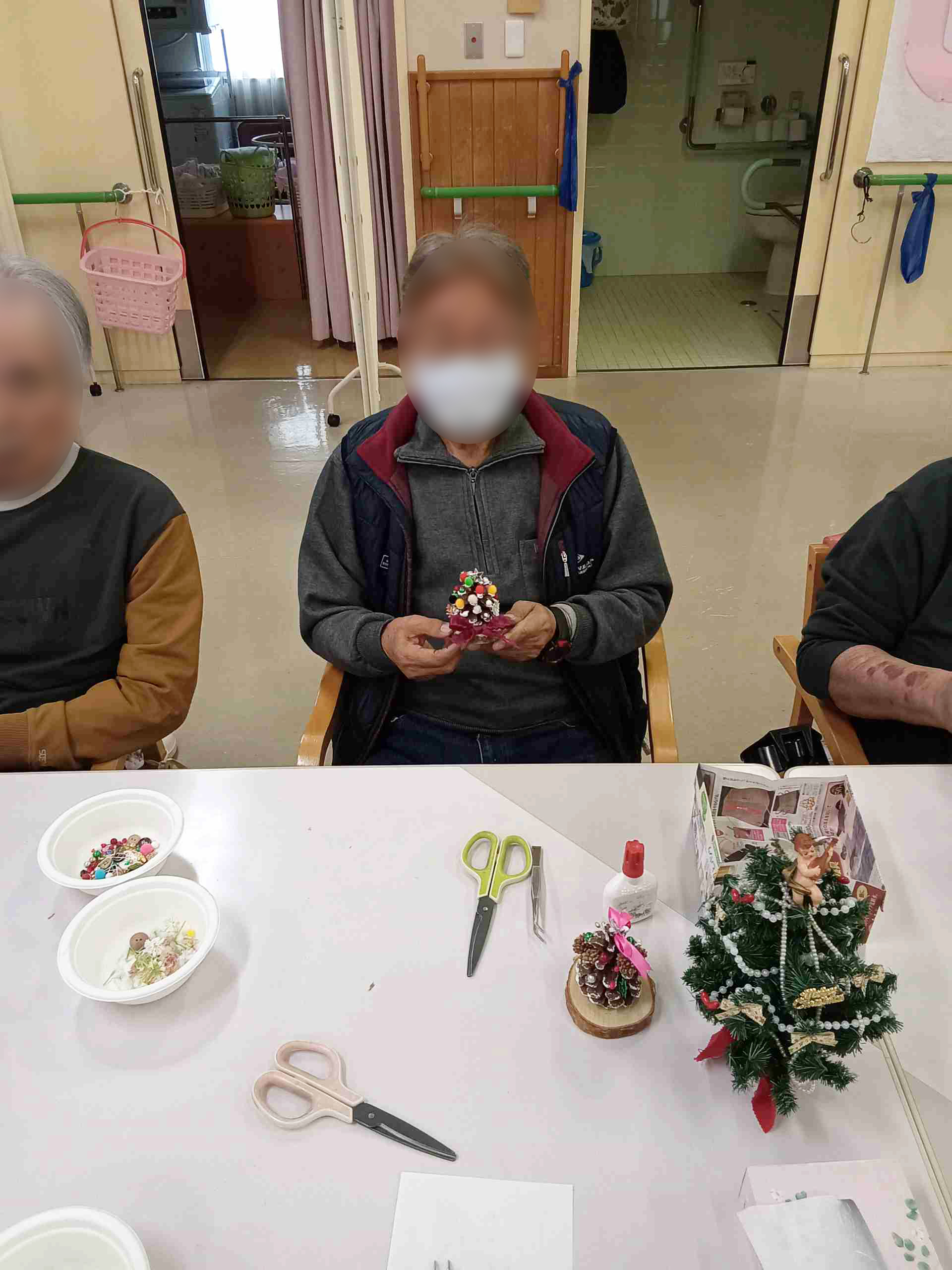 本日のデイサービスでは、松ぼっくりを使ったクリスマスツリーの制作活動を行いました!