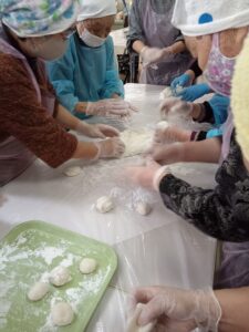 お餅がつき上がり、「さ〜丸めますよ~!」の音頭と共に一気に丸め上げ。